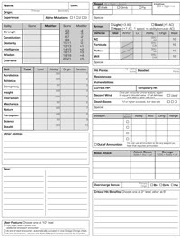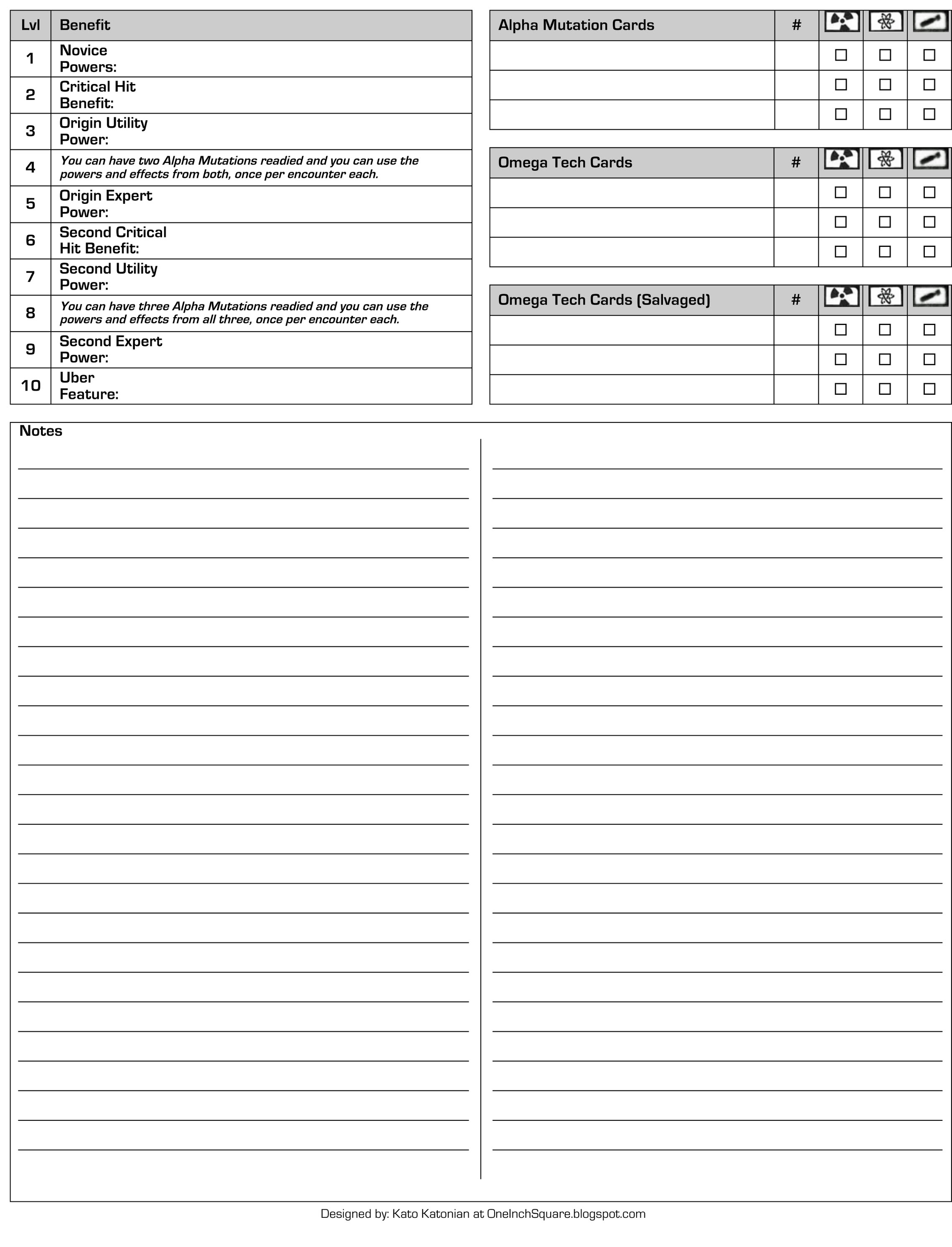 The front side features just about every bit of information you’ll need in front of you during play. The most important items are highlighted with a bold border to help them stick out. Sections that are used in creating the character but aren’t directly referenced in game (e.g. the columns of various bonuses for skills) are slightly greyed to set them off. Wherever possible, hints are given in cells to show where a particular bonus or bit of information should come from to speed up character generation and add clarity. Here’s an example of the front side filled for a first level character. The back side has a place for the player to record which powers, etc., they’ve taken at each level as well as a large area for notes. There are also places to record which Alpha and Omega cards the player has in order to keep track between sessions.The character sheet does not have space for power descriptions (though one could use the “notes” section) as it is assumed that players are using some sort of cards or printouts with that information on it. And of course I recommend the Character Origin Cards found on this blog as an aid in character creation and play.