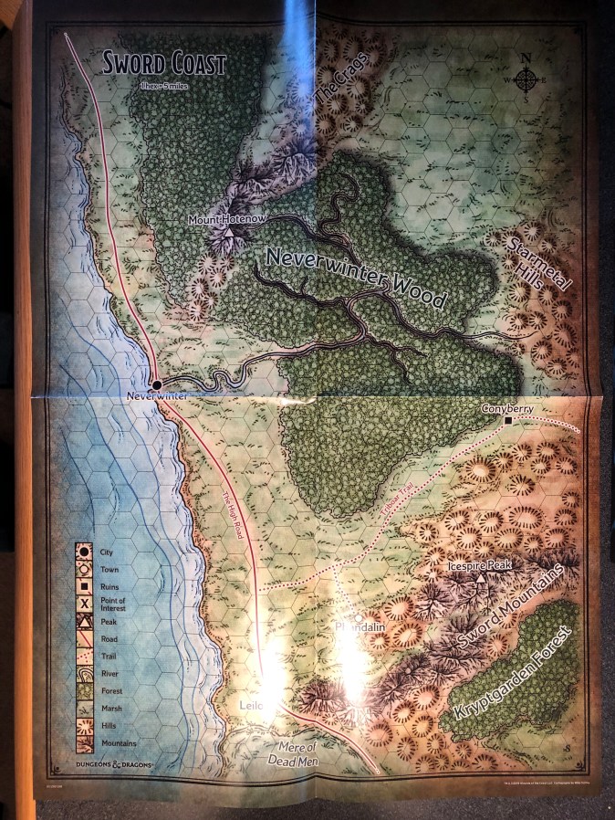 There is one 15″x 21″ double-sided foldout poster map showing the Sword Coast on one side and the town of Phandalin on the other. Wish every adventure came with a region map…