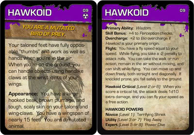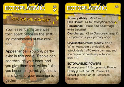 These double-sided cards reprint almost all of the information found in the origin section of the rulebook, including the origin’s name, description, full trait information, critical hit ability, and power names. They contain all the information a player needs while creating their characters and serve as a handy reference during play. Since power descriptions are too lengthy and really deserve their own cards, I have only included their names (For power cards, I recommend these fantastic cards by AH_Anarchy).