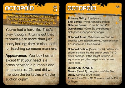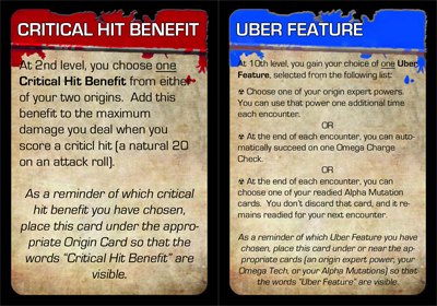 Critical Hit Benefit / Uber Feature Card: At 2nd level, players can place the Critical Hit Benefit side of this card under the origin card of the origin from which they chose their critical hit benefit to serve as a reminder. At 10th level, the Uber Feature side of the card can be used to remember which uber feature has been chosen by placing it under an expert power card, omega tech cards, or an alpha mutation.