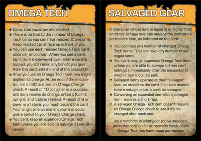 Omega Tech / Salvaged Gear Card: The Omega Tech side of this card gives the run down on Omega Tech card rules, particularly the Omega Charge roll. The Salvaged Gear side details how salvaging works, and can be placed near or under salvaged Omega Tech cards to distinguish them from non-salvaged tech.