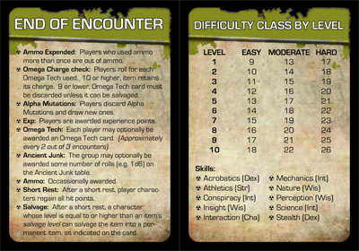 End of Encounter / Difficulty Class By Level Card: This is intended as a GM quick reference card. The End of Encounter side gives a run down of the common things that happen post encounter (e.g. Omega Charge check, changing Alpha Mutations, handing out rewards, etc.) The Difficulty Class By Level side reprints the chart of the same name from the rulebook as well as the list of skills found in Gamma World.