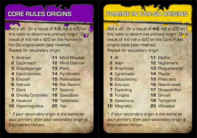 Core Rule Origins / Famine In Far-Go Origins Card: This is intended as a GM reference card. The Core Rule Origins side lists all the origins from the Gamma World Rulebook, the Famine in Far-Go Origins side lists all the origins from the first expansion.