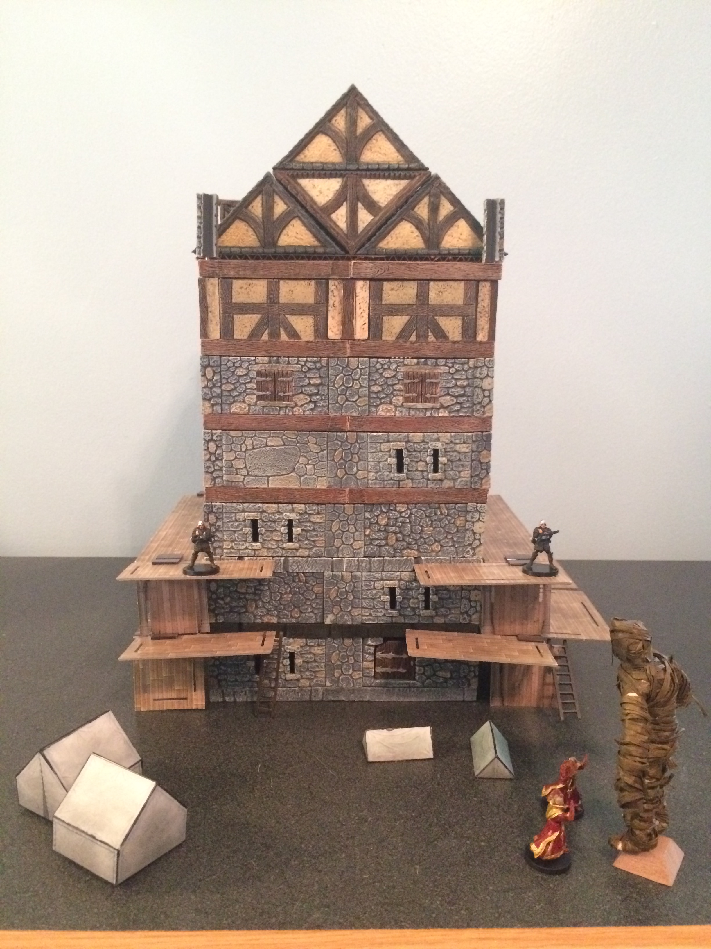This is the south side of Scarlet Moon Hall which faced the players at my table. Six floors are recreated in Dwarven Forge city builder terrain, with the concession that in-game each floor is 15 feet high, but at the table a given floor is represented by wall terrain that is scaled to only around 5-7′ tall (due to limitations in how you can stack Dwarven Forge building terrain). The scaffold on either side is composed of D&D Dungeon Tiles. In the foreground are papercraft tents and a custom Wicker Man figure.