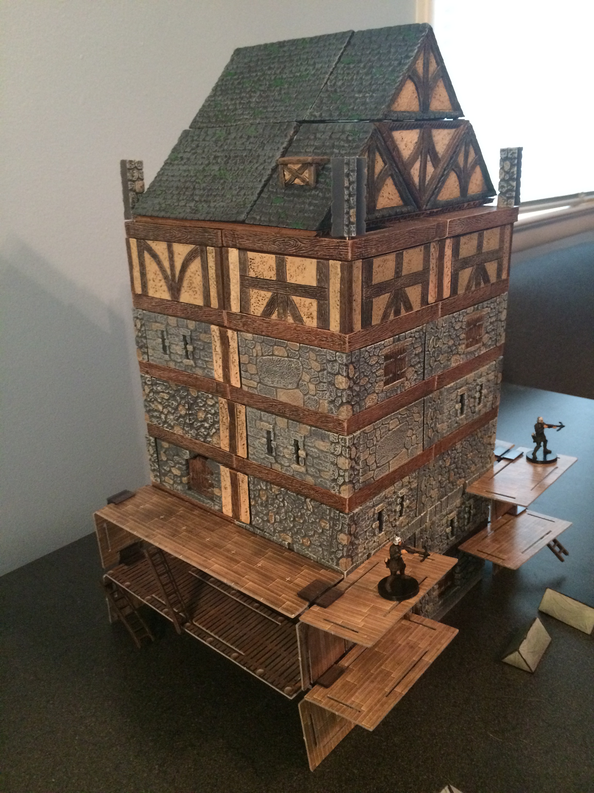The west side of Scarlet Moon Hall shows more of the scaffold leading to the side door. I alternate arrowslit windows around the sides as well. Here I have chosen to use tudor double posts to connect the walls making up the sides instead of the stone ones used in the front. This was mainly done for practical purposes (I had tudor posts and not enough stone posts for the whole tower) and aesthetic reasons (it breaks up the wall pattern a little).