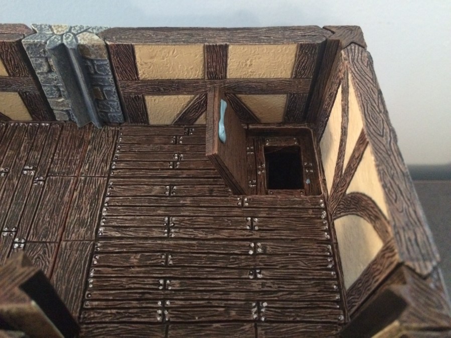 The trapdoor in the attic flipped open. The blue stuff is poster tack to keep it in place during transport and play.