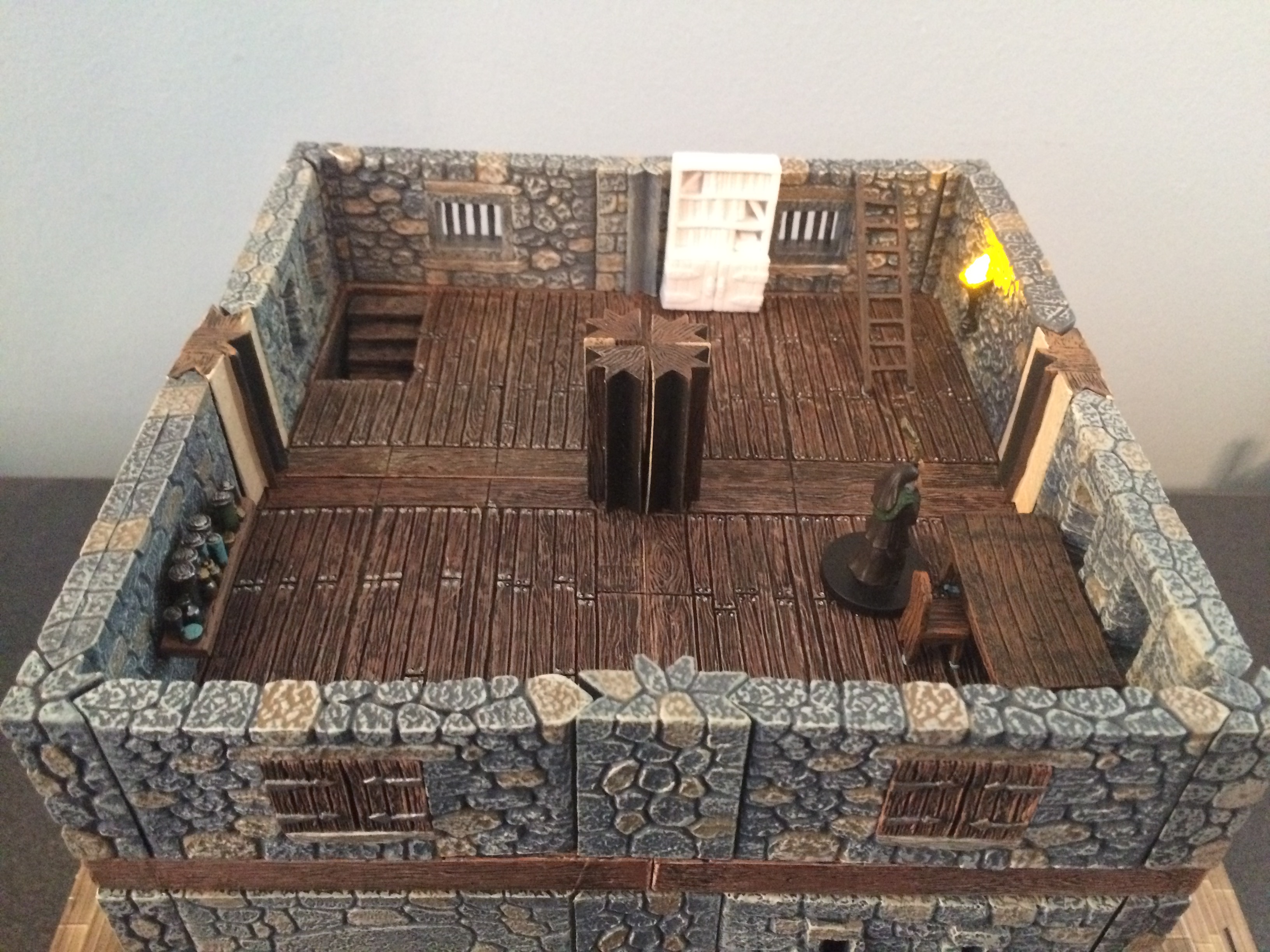 The floor here is made up of mostly solid tudor floors with a stairwell opening in the NW corner. A ladder leads up to the attic, and the room is decorated with a Dwarven Forge table and chair from the Dungeons set, as well as a Reaper Bones bookshelf that I shamefully haven’t painted yet. The back walls have windows with iron bars (mostly because it was the walls I had left), the NW and SE walls are arrowslits, the south-facing walls have windows with shutters, the NE wall bears a flickering LED torch, and the SW wall is magnetic with a shelf accessory.