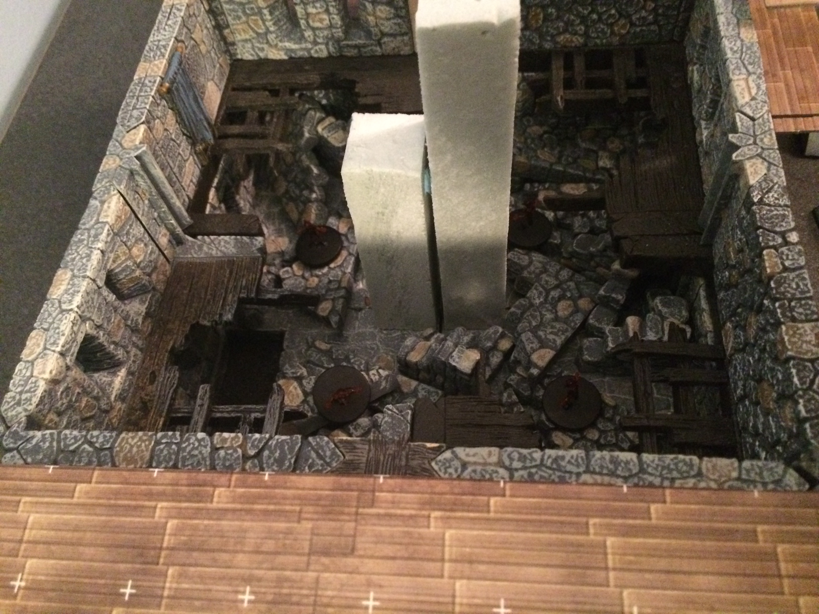 Looking East into the upper part of the downward path. A smaller foam block serves to hold up the floor pieces of the 3rd floor.