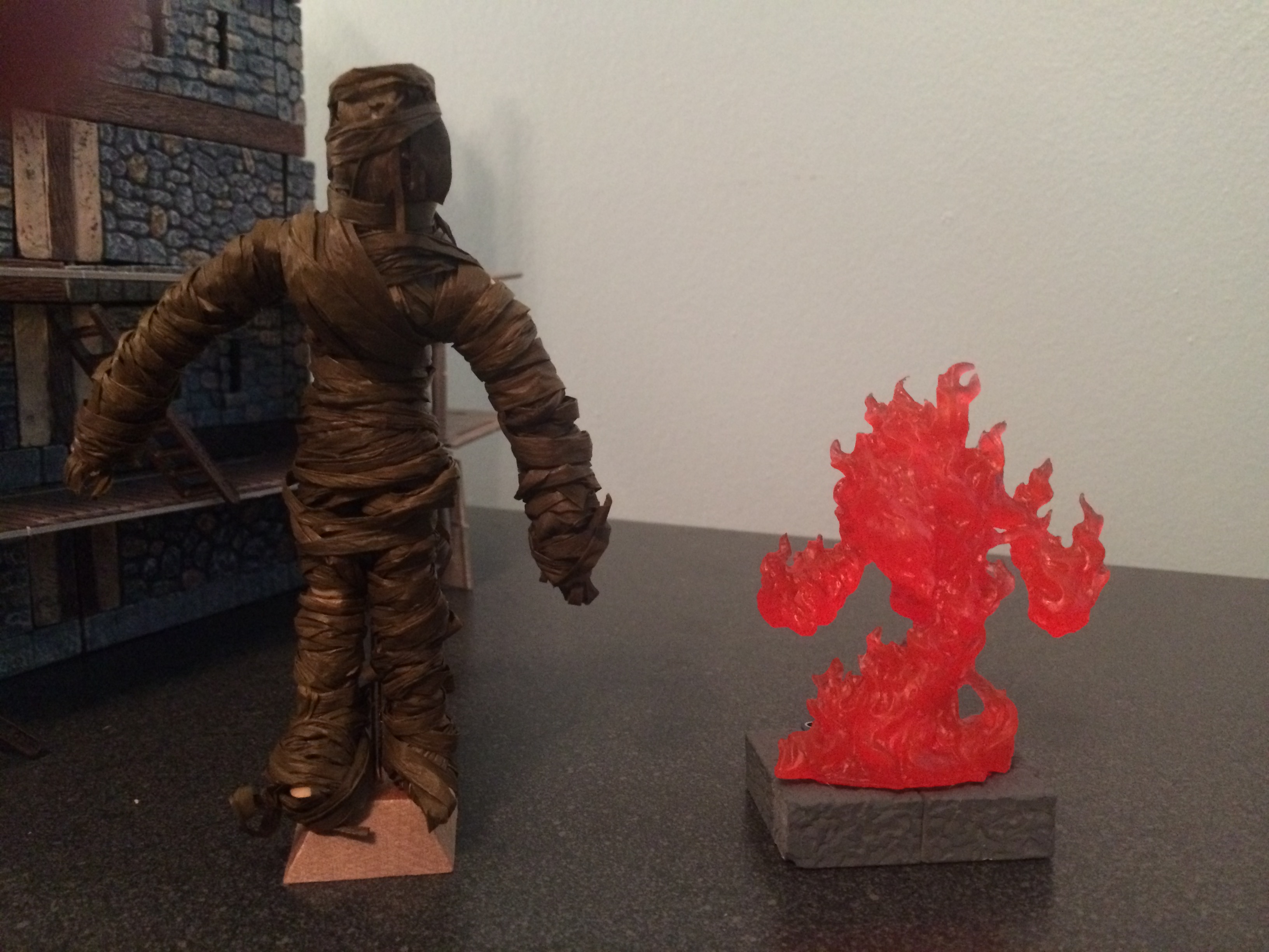 The Wicker Giant is actually pretty close to scale–the text says two stories, which would be around 20 feet, and the manikin is about 5 inches tall. The fire elemental looks a little small by comparison.