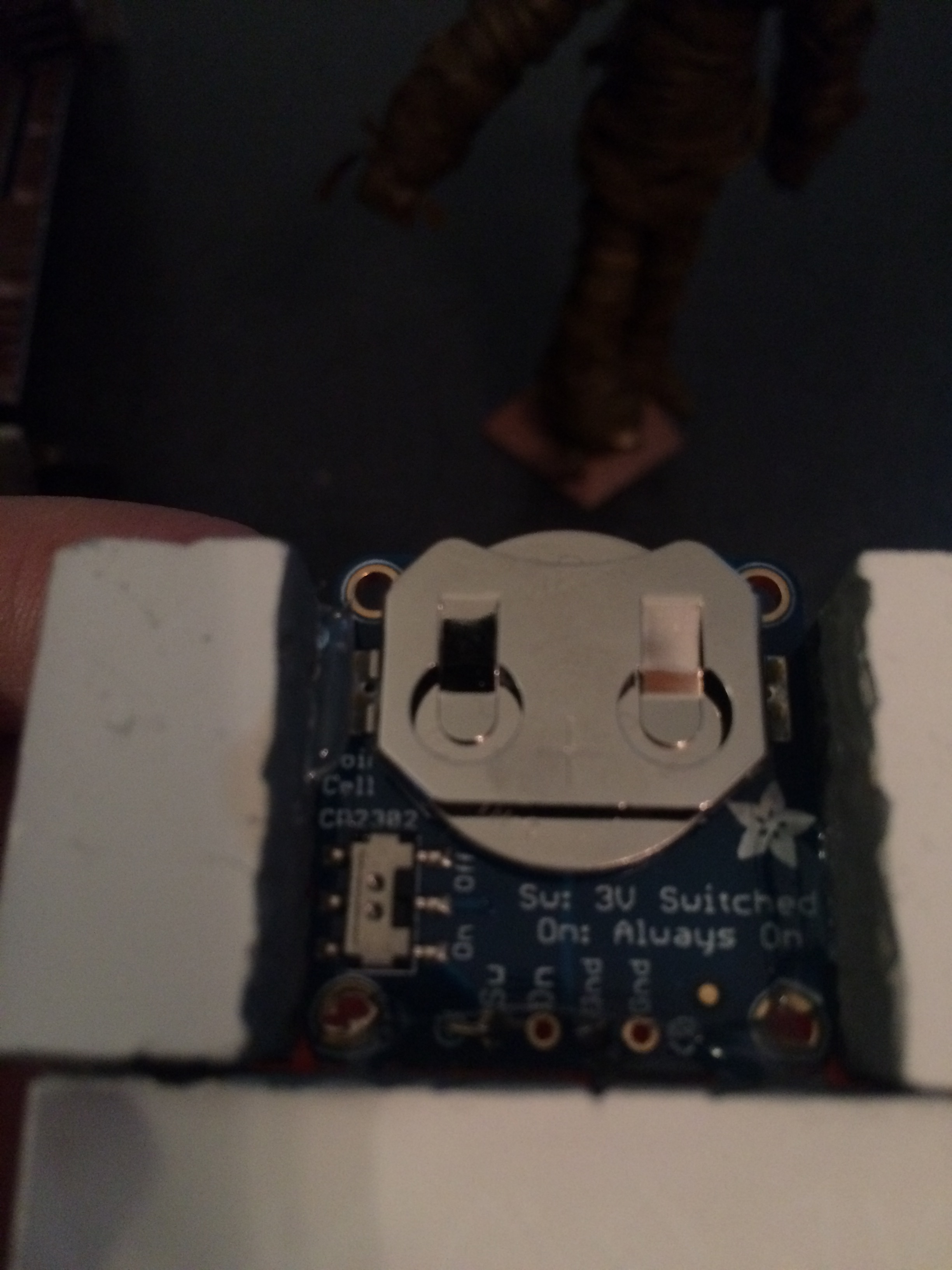This is the board that sits underneath the Fire Elemental miniature and powers the flickering LED, while also providing an easy way to turn it on and off. Assembly was relatively easy, I simply ran the leads of the LED through the appropriate holes (Sw and Gnd), soldered it in place, and trimmed away the excess. The LED stick up off the other side of this board and into a hole I drilled into the miniature. I used some leftover Hirst Arts pieces to make a base to contain the switch and raise it off the table some.