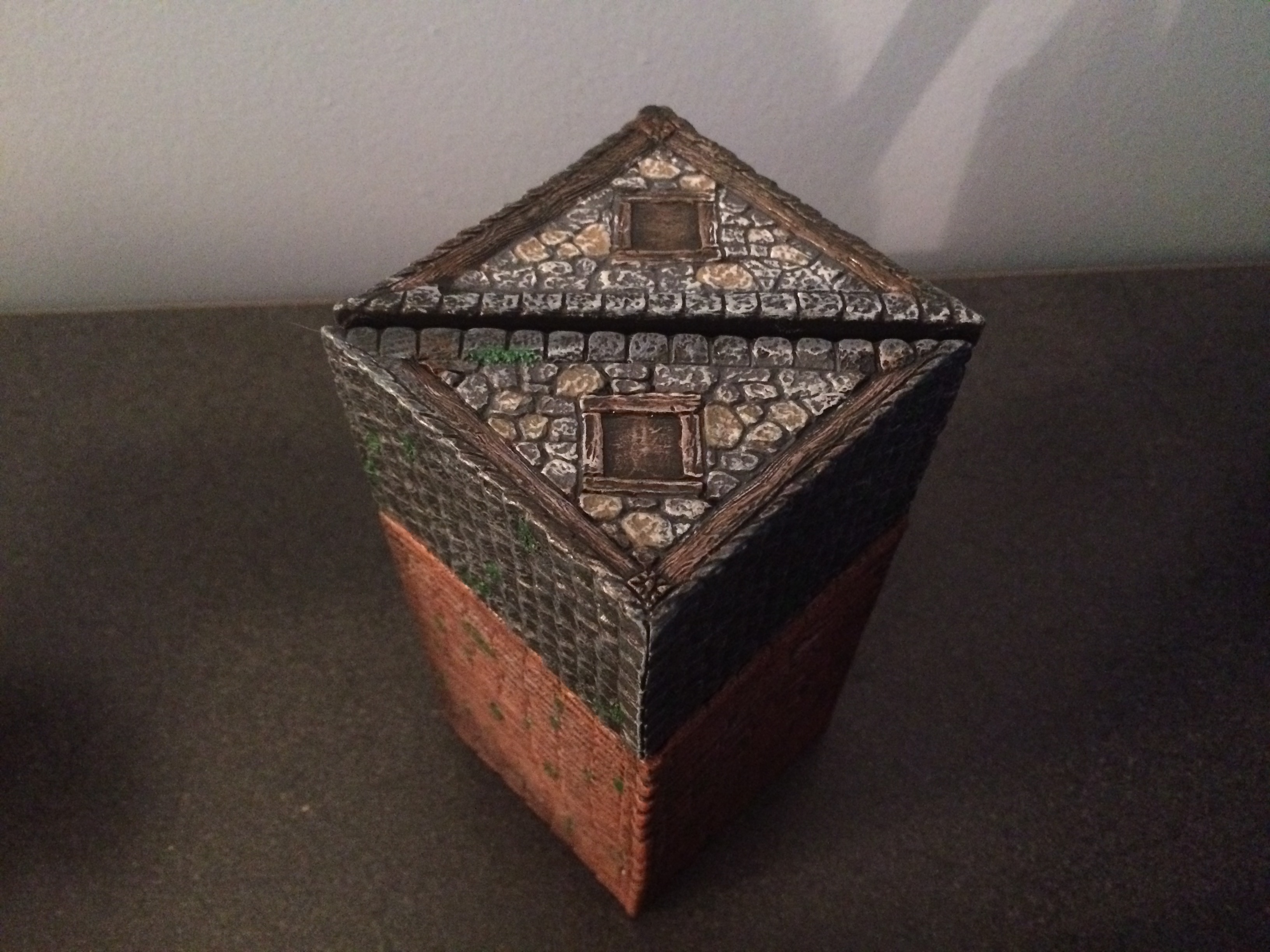 The middle section of the roof was formed by stacking roof pieces base-to-base. I used whatever roof pieces I had handy, mixing slate and terracotta. They are shown here sitting standing up on one end for ease of photographing; in the actual build they were stacked such that the downward peaks set into the valley formed by other roof pieces.