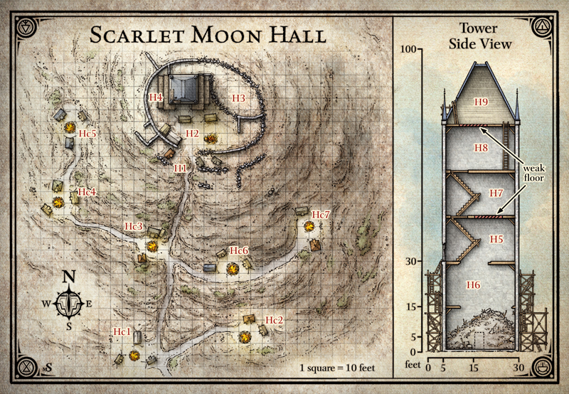 When translating the map of Scarlet Moon Hall to terrain, I had to take some liberties with the design due to practical constraints of the Dwarven Forge pieces I was using. The outside of the tower ended up being 8 inches wide, with room interiors measuring about 7 inches. This translates to about 35 feet, which is 10 feet bigger than the tower in the map. Because the Dwarven Forge walls are only an inch and a half tall (two inches including the height of the floor pieces), the stories in my tower were only 10 feet tall instead of 15. The scaffolding is more extensive in the map. I had to reduce it to only two floors of scaffold (compared with one every five feet) to match the scale of the Dwarven Forge pieces, as well as accommodate miniatures.