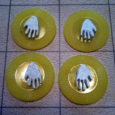 After much searching, I finally managed to find a pewter hand charm sold by an online jewelry supply shop that would make due in a pinch.  The size was perfect:  not much more than half an inch long.  Of course, since they were supposed to represent skeleton hands, I slapped a quick couple coats of white paint on them.  I also clipped off the loops since I obviously wasn’t planning on using them as charms. Finally, to make them easier to manipulate, I affixed them each to a plastic chip with a bit of sticky tack.  Voila, instant Crawling Claw!