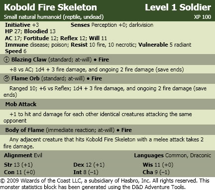 These creatures provided a fun, unexpected encounter for the PCs who were in the middle of patting themselves on the backs for dispatching Irontooth and his minions.  In the actual encounter in which they appeared, I tossed a handful of kobold minions at the PCs (a hunting party that had returned to the cave and was ordered by Irontooth to guard the entrance), surprising the players by having the skeletons rise in the second round of combat. The appearance of flaming kobold skeletons that shot fire from their eye sockets elicited a couple of “whoas” and at least one “cool”, which, as a DM, is one of the more rewarding words you can hear at the table.